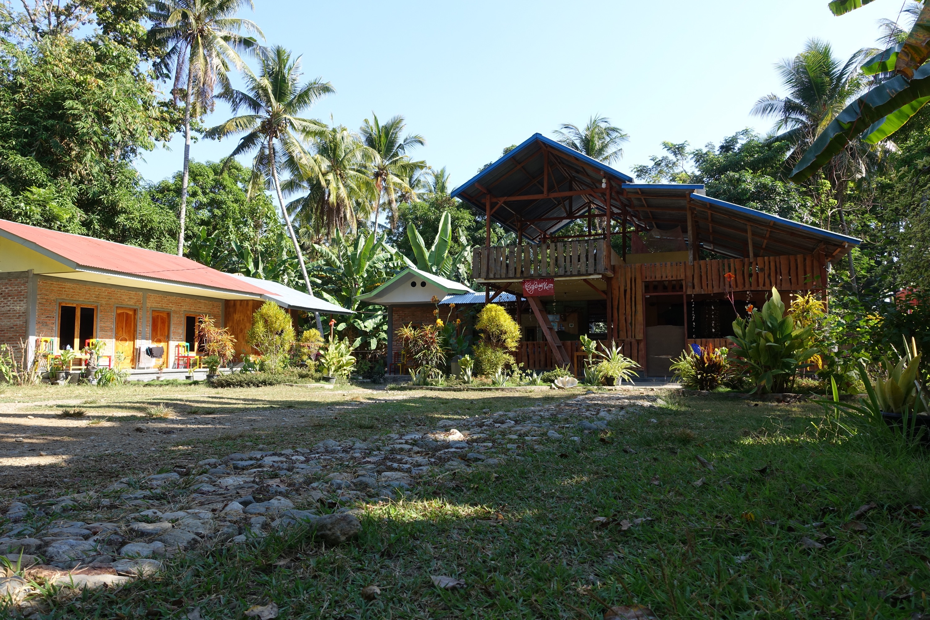Also angekommen am Etappenziel Nummer zwei: Riung und die „17 Islands“. Verschlafen, verträumt und irgendwie am Ende der Welt präsentiert sich hier ein Dorf das sich gerade erst im Aufbau der touristischen Infrastruktur befindet und aufgrund seiner Lage und der damit doch recht schwierigen Erreichbarkeit noch als Geheimtipp zu werten ist. Einquartiert waren wir für zwei Nächte im „Cafe Del Mar“ wo die Manschaft um Itchan in sehr relaxtet Arbeitshaltung soweit alles bietet bzw. macht was man hier braucht oder unternehmen kann. Übernachtung und vor allem auch das Restaurant sind uneingeschränkt zu empfehlen- vorausgesetzt man verhungert nicht gerade und hat ein bisschen Zeit, aber das Thema hatten wir ja schon…