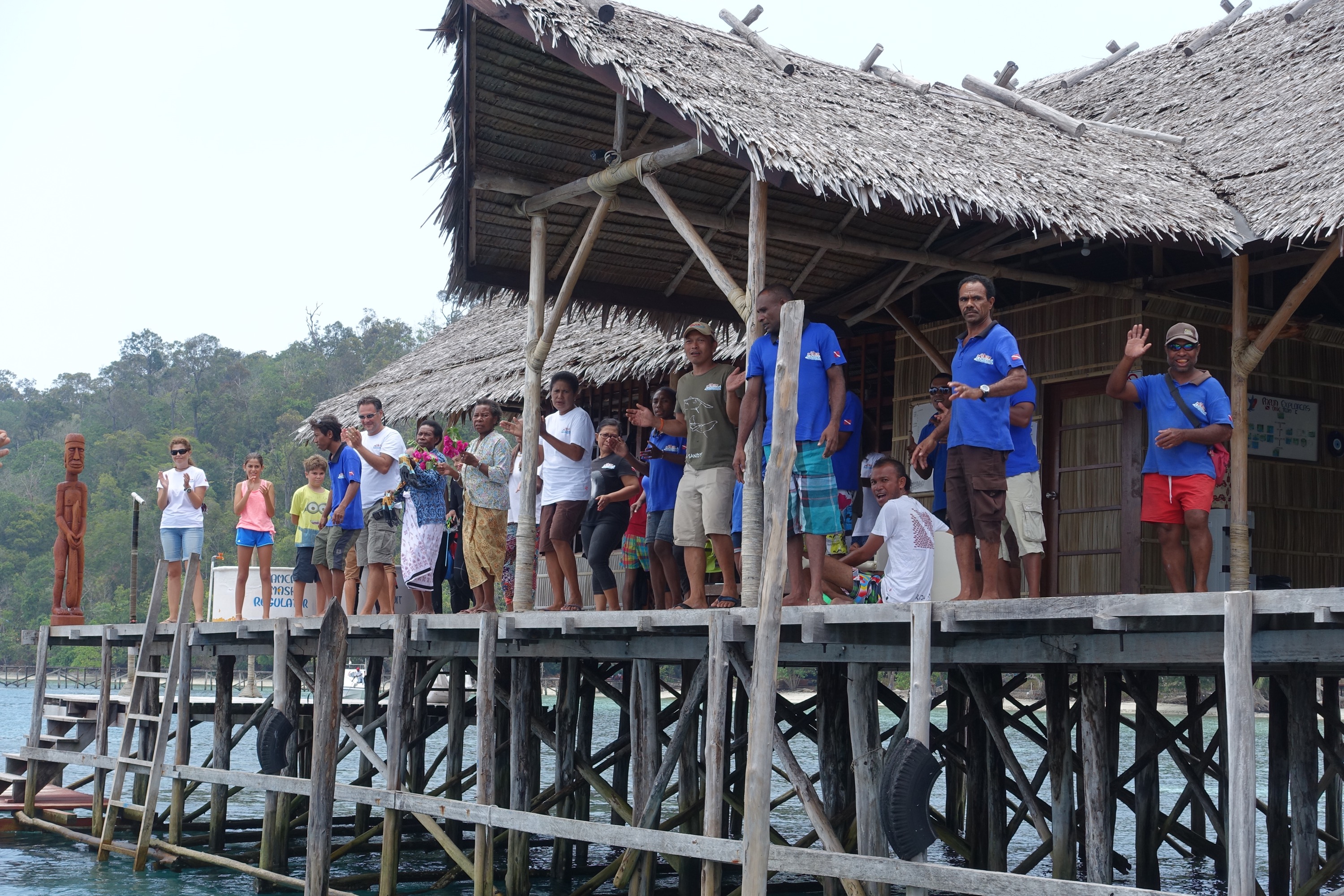 Die Abholung am Flughafen erfolgte bereits durch unser gebuchtes Resort „Papua Explorers“. Alles gut organisiert und sehr professionell durchgezogen, würden wir zunächst in ein nahegelegenes Hotel (Swiss Bellotel Sorong) gebracht, dort hatten wir Zugang zum Frühstücksbüffet und konnten anschließend bis zur Abfahrt des Transferbootes noch ein bisschen in der Lobby entspannen. Die Fahrt zum Pier dauerte ca. 15 Minuten, gefolgt von knapp über zweieinhalb Stunden Transfer zum Resort. Hier wurden wir sehr freundlich, ja quasi eigentlich schon eher kitschig von den Angestellten und Besitzern, singend empfangen.